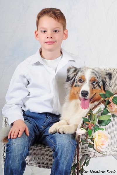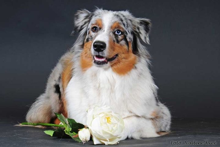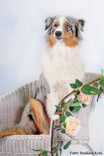 Unsere Rose ist unsere blue merle farbende Nachzuchthündin. Sie möchte immer und überall gefallen und es macht sehr viel Spaß mit ihr zu arbeiten. Sie ist überall, genau wie ihre Mama, beliebt und wer von ihr noch nicht überzeugt ist, den überzeugt sie mit ihrem Charme und wickelt ihn um den Finger. Ihr größtes Hobby ist das KUSCHELN! Am liebsten immer und überall. Sie ist einfach nur Klasse. Rose ist eine ausgeglichene und ruhige Hündin. Genau das, was ich für meine Zucht gesucht habe. Im Showring kann sie immer wieder überzeugen. Sie ist unsere Zukunft. Rose ist mittlerweile Jugendchampion im CASD und im VDH und Champion im VDH.